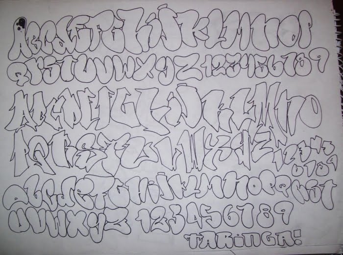 A sketch graffiti alphabet created by artists who called Taringa. Graffiti sketch was made with an easy and simple way on a paper. Of course, with lots of character design, not just one just because of this sketch artists want to reconcile some of the characters to be compared with the obvious which ones you think are the best. There are types of graffiti alphabet bubble model, wildstyle, flava, and so forth. Comparing a different character designs may not be the right thing because every character of a design has its own advantages and even has a fan so it is not ideal. It would be better to add the model number of our imagination for the better. Become more unique and diverse.